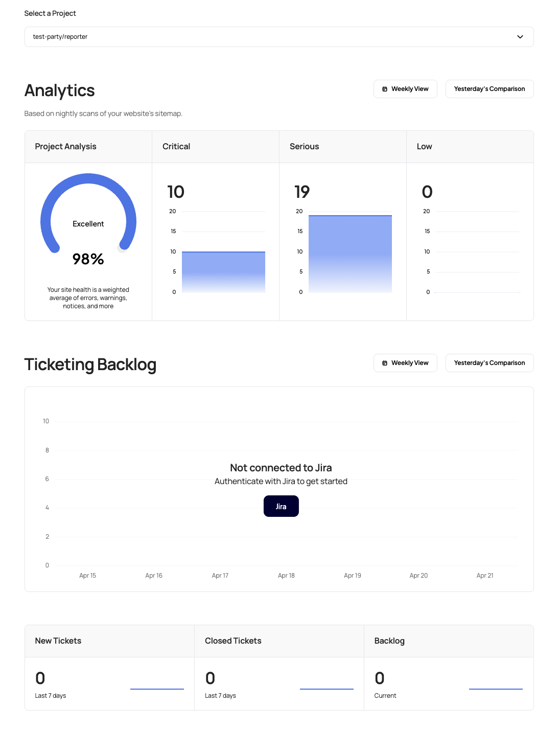 The Ticketing Backlog section seamlessly connects accessibility findings with project management workflows: